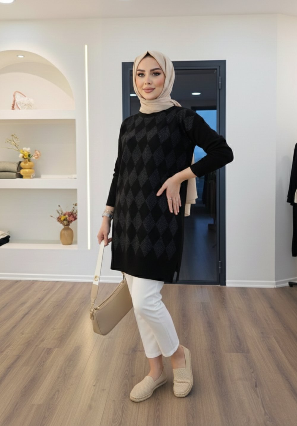 Baklava Desen Simli Triko Siyah
