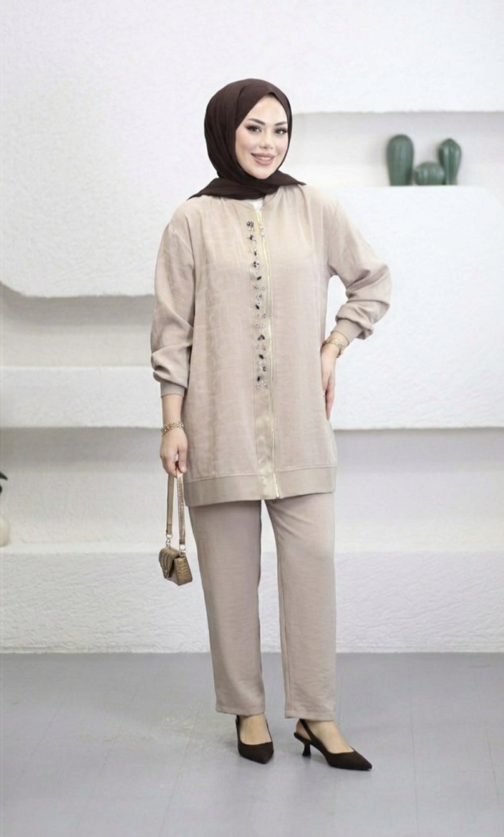 1. Kalite Tensel Fermuar ve Taş Detaylı Takım Modern ve zarif tasarımıyla öne çıkan Tensel tesettür takım, yumuşak dokusu ve nefes alan yapısıyla gün boyu konfor sunar. 1. kalite tensel kumaşı sayesinde hafif, dökümlü ve rahat bir kullanım sağlar. Ön kısmındaki fermuar ve taş detayları takıma şık ve göz alıcı bir hava katarken, rahat kesim pantolonu ile hem günlük kombinlerde hem özel davetlerde tercih edilebilir. Tesettür giyimde hem konforlu hem şık bir takım arayanlar için ideal bir seçimdir. Ürün Bilgileri Kumaş: 1. Kalite Tensel Beden: 1 (38-40) – 2 (40-42) – 3 (42-44) Tunik Boy: 80 cm Pantolon Boy: 100 cm Detay: Fermuar ve taş detaylı Şıklığı ve rahatlığı bir arada sunan bu tensel takım ile stilinizi zahmetsizce tamamlayın. ✨