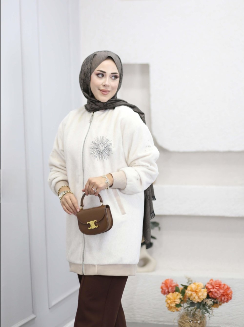 Taşlı Bomber Kaban Ekru