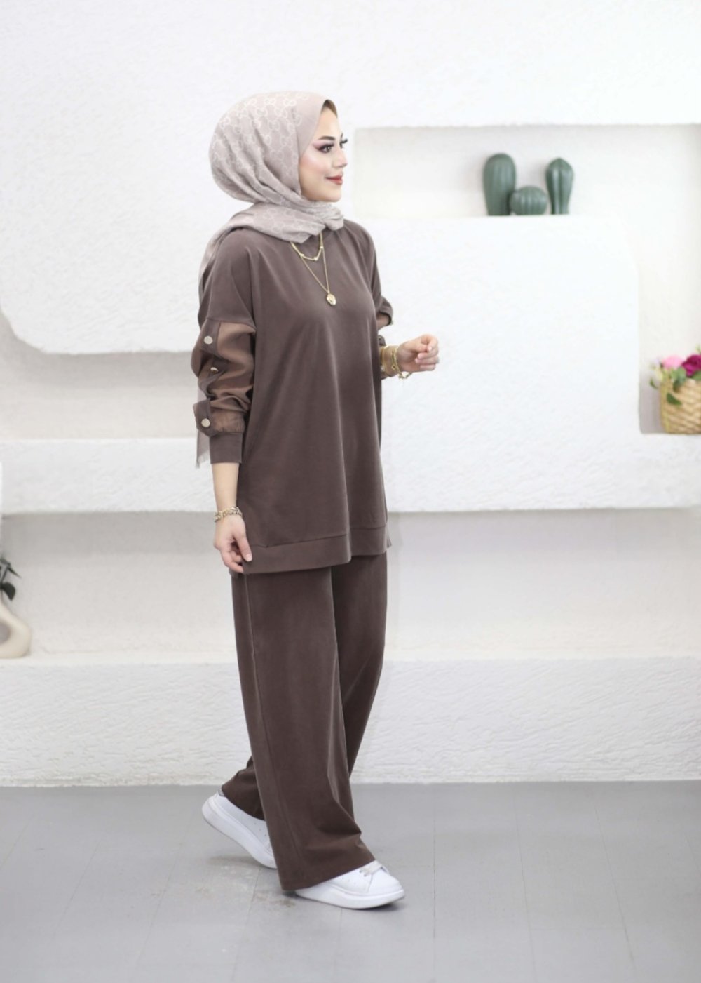 Yaka Büzgülü Takım Kahverengi